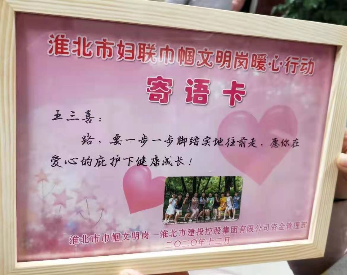 圖為12月10日市建投集團(tuán)資金管理部代表參加淮北市“巾幗文明崗暖心行”活動(dòng)——走進(jìn)百善,為百善鎮(zhèn)16 名貧困兒童送去圖書、學(xué)習(xí)用具以及勵(lì)志寄語,溫暖了貧困兒童的心。
